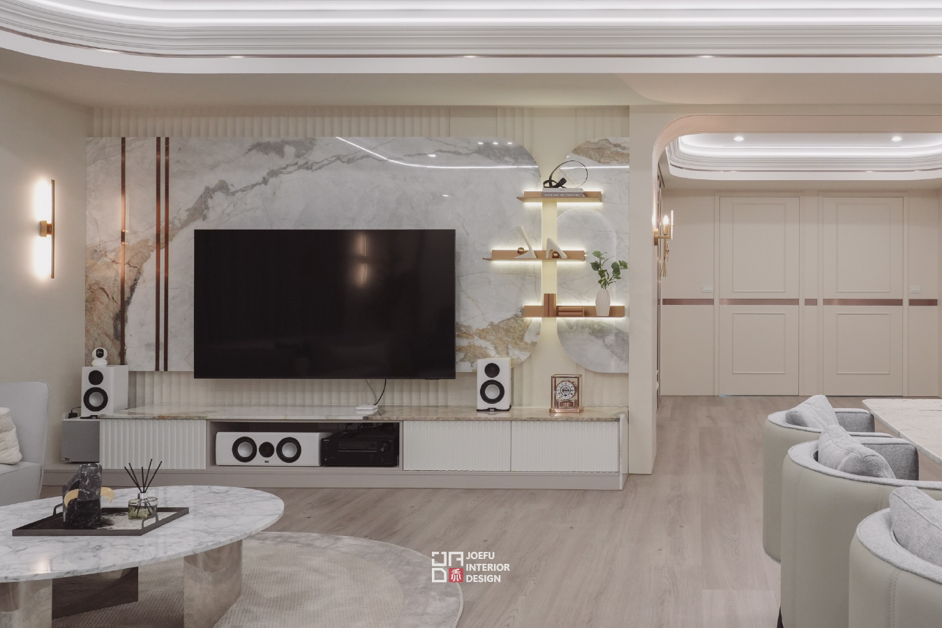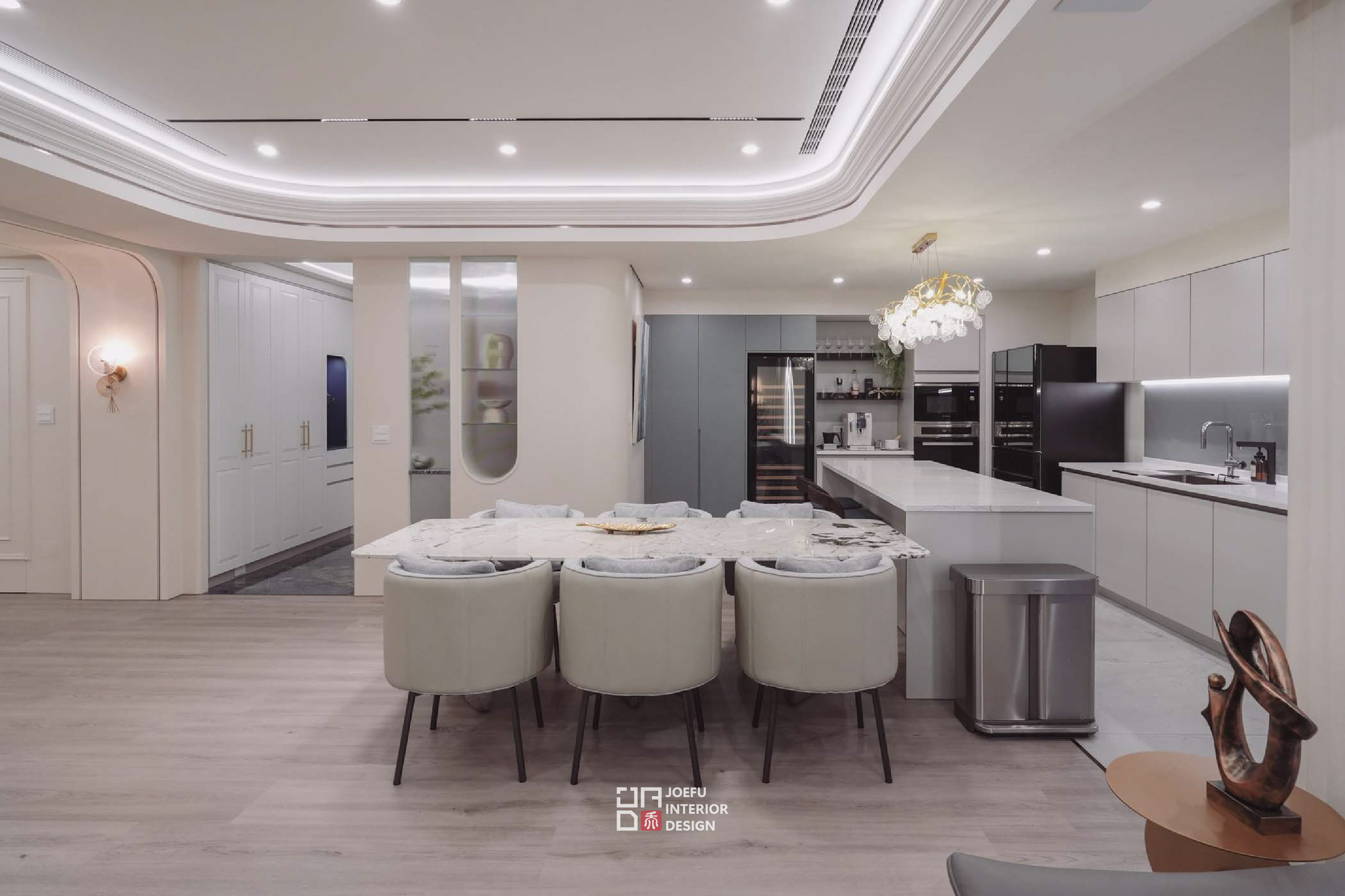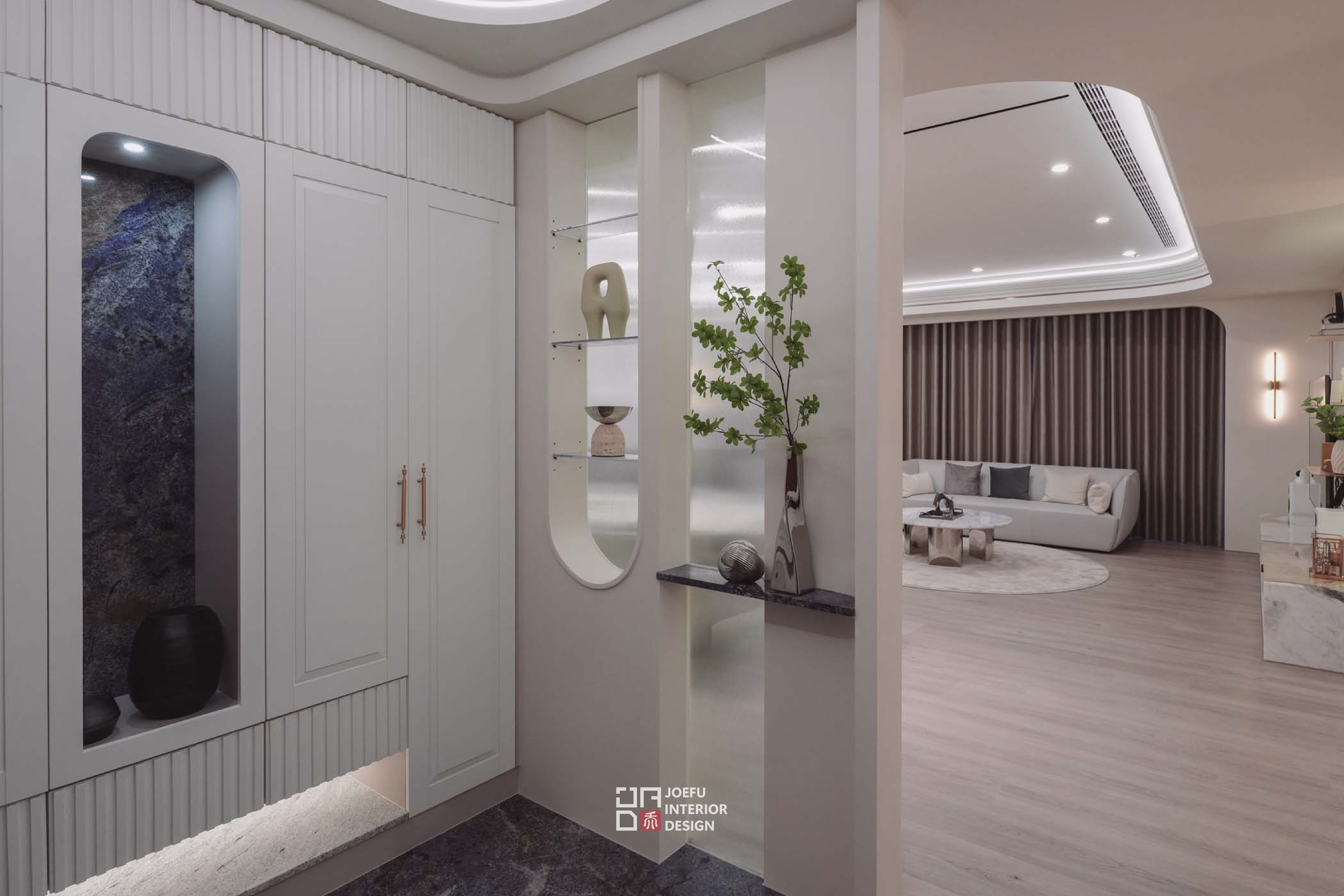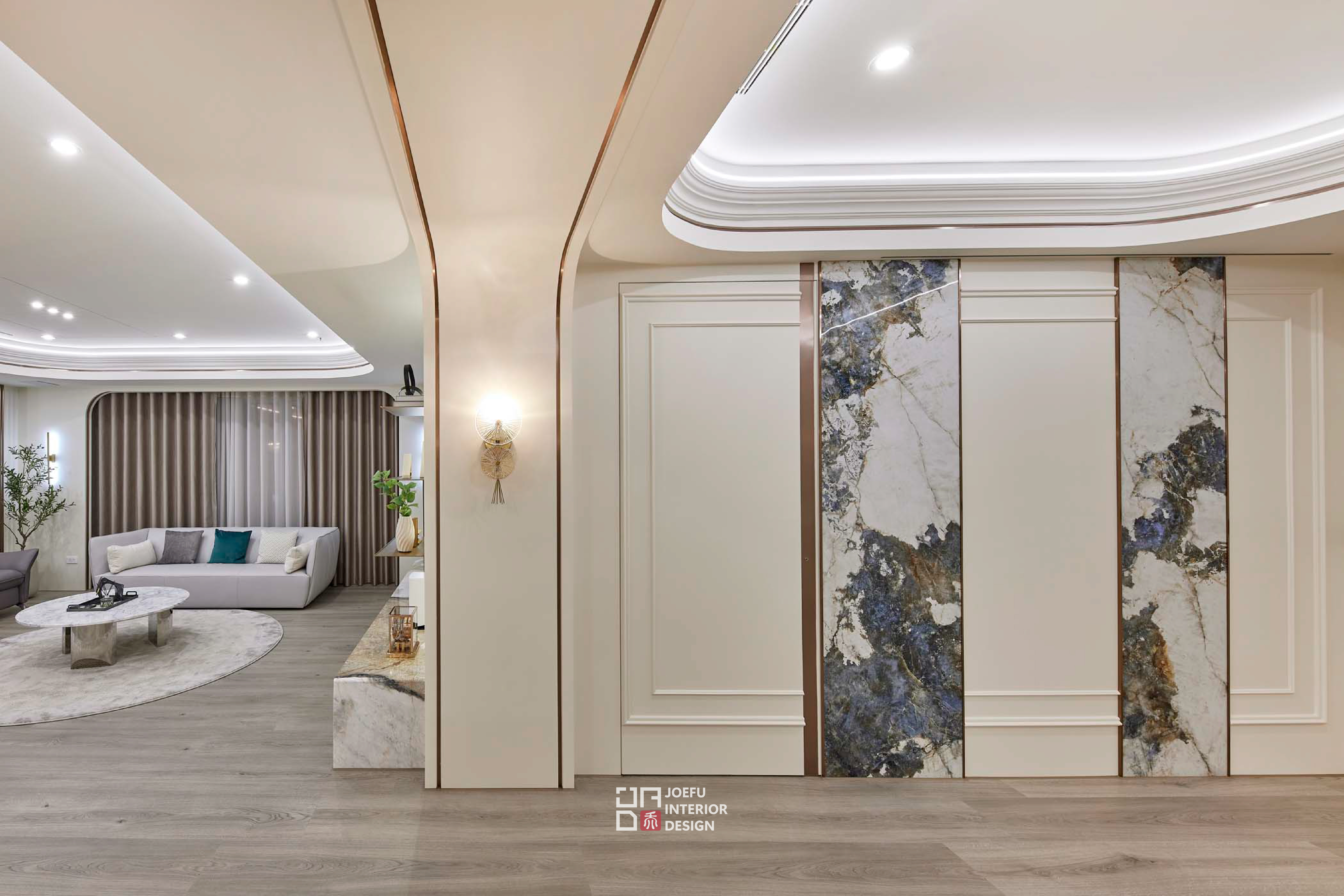 踏進玄關,像是看見一隻孔雀展翅,拖曳著斑斕尾羽悄然開場。弧形玻璃端景穿透光線,水晶吸頂燈將反射光點灑落在帶有藍、金、灰斑紋的大理石地坪上,如夢似幻卻穩定節奏。金色的把手如同孔雀翦翦長睫,細節處的光,襯托出整體空間華而不俗的第一印象