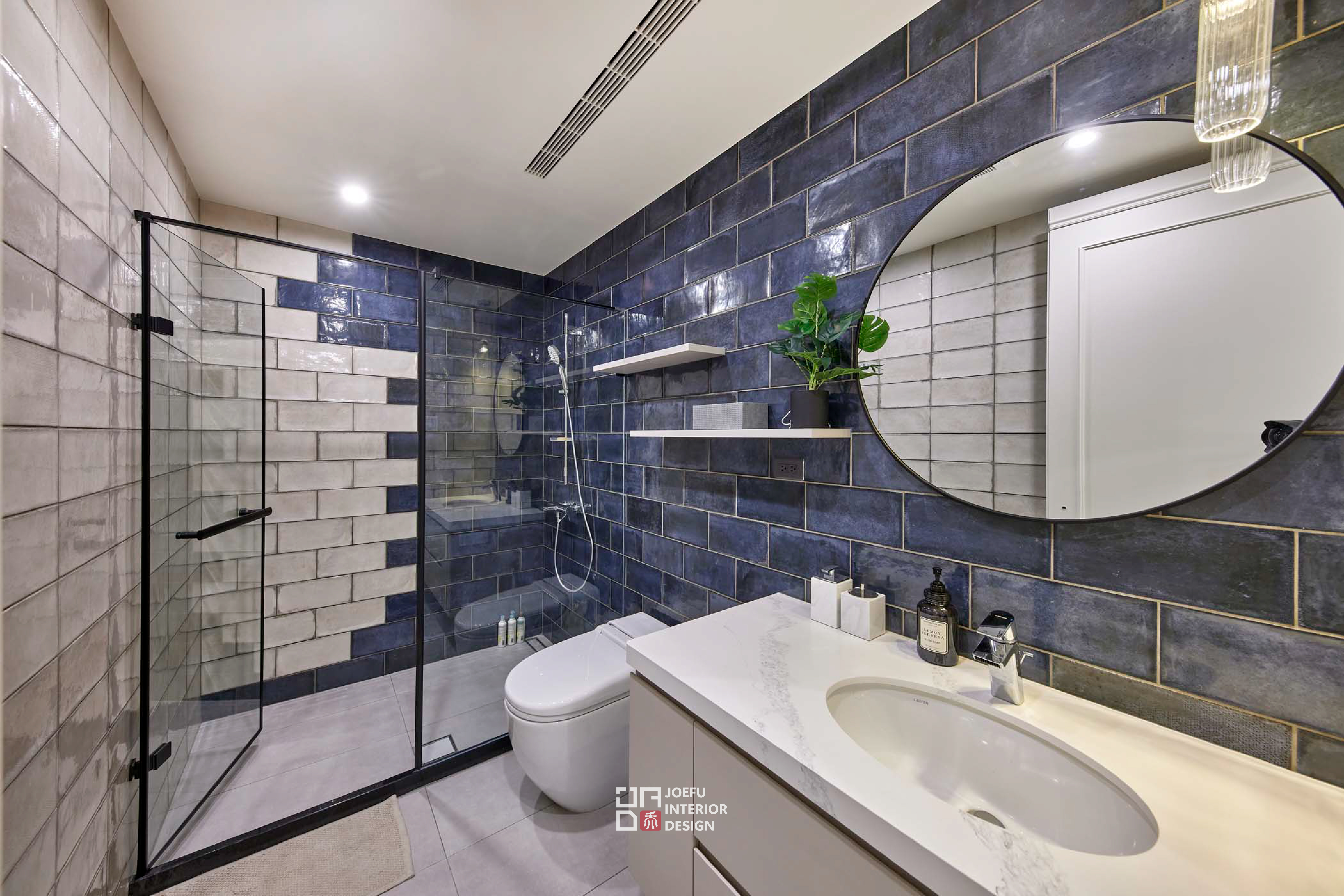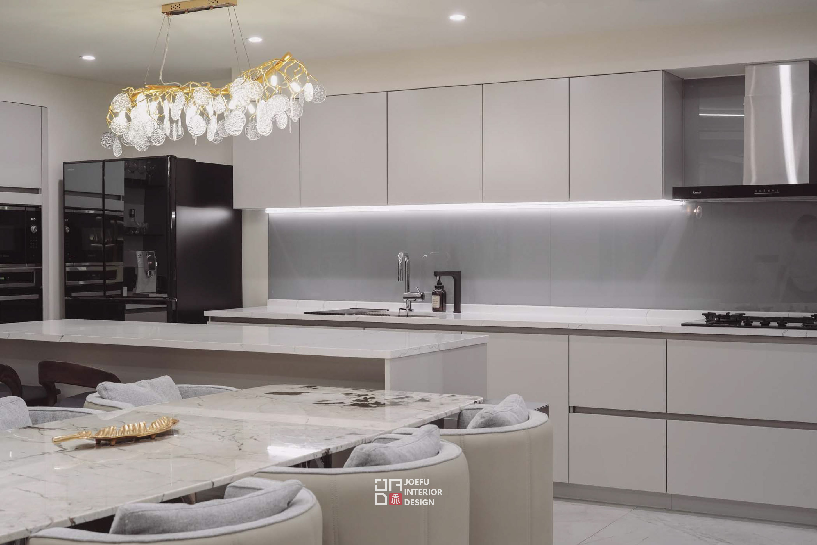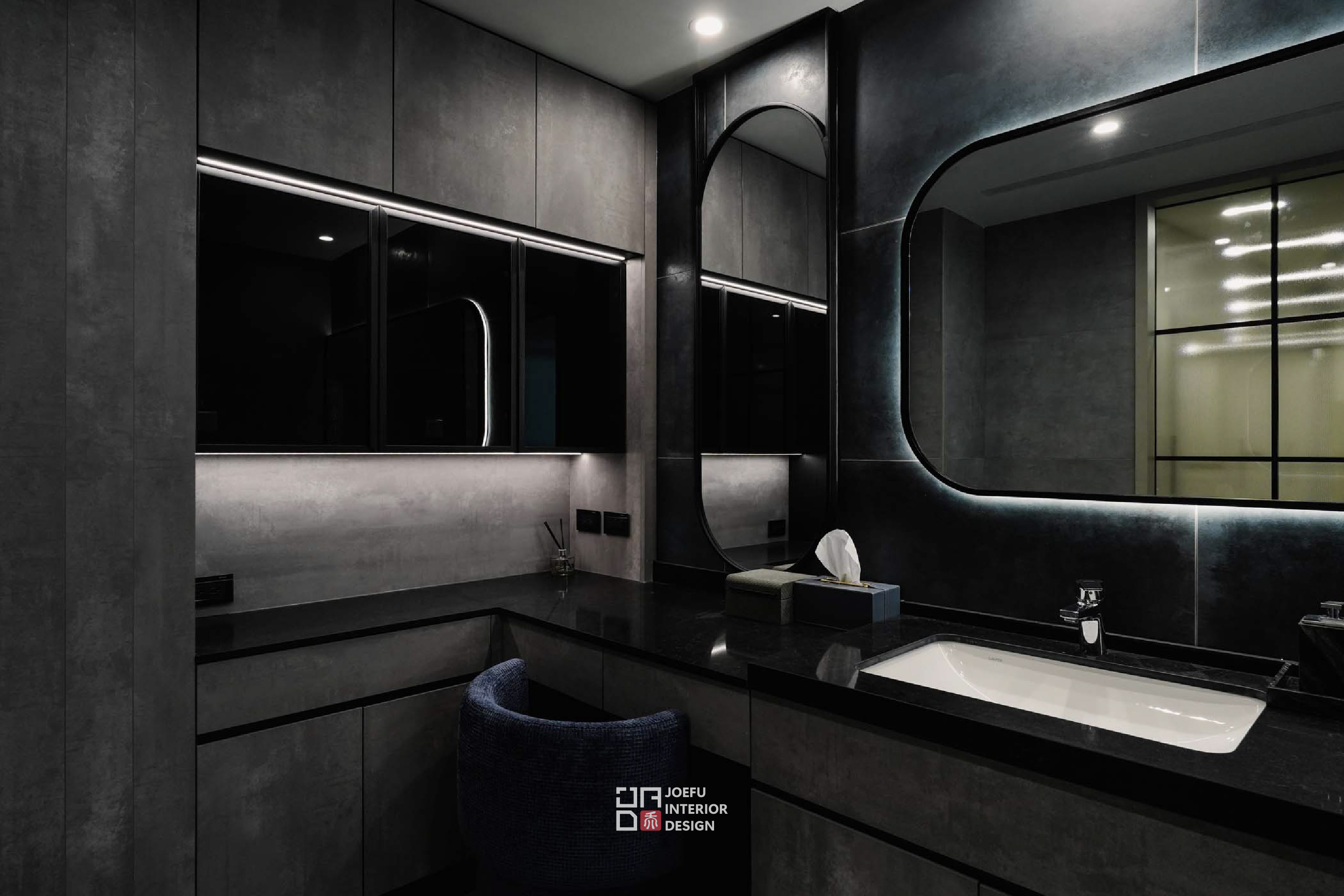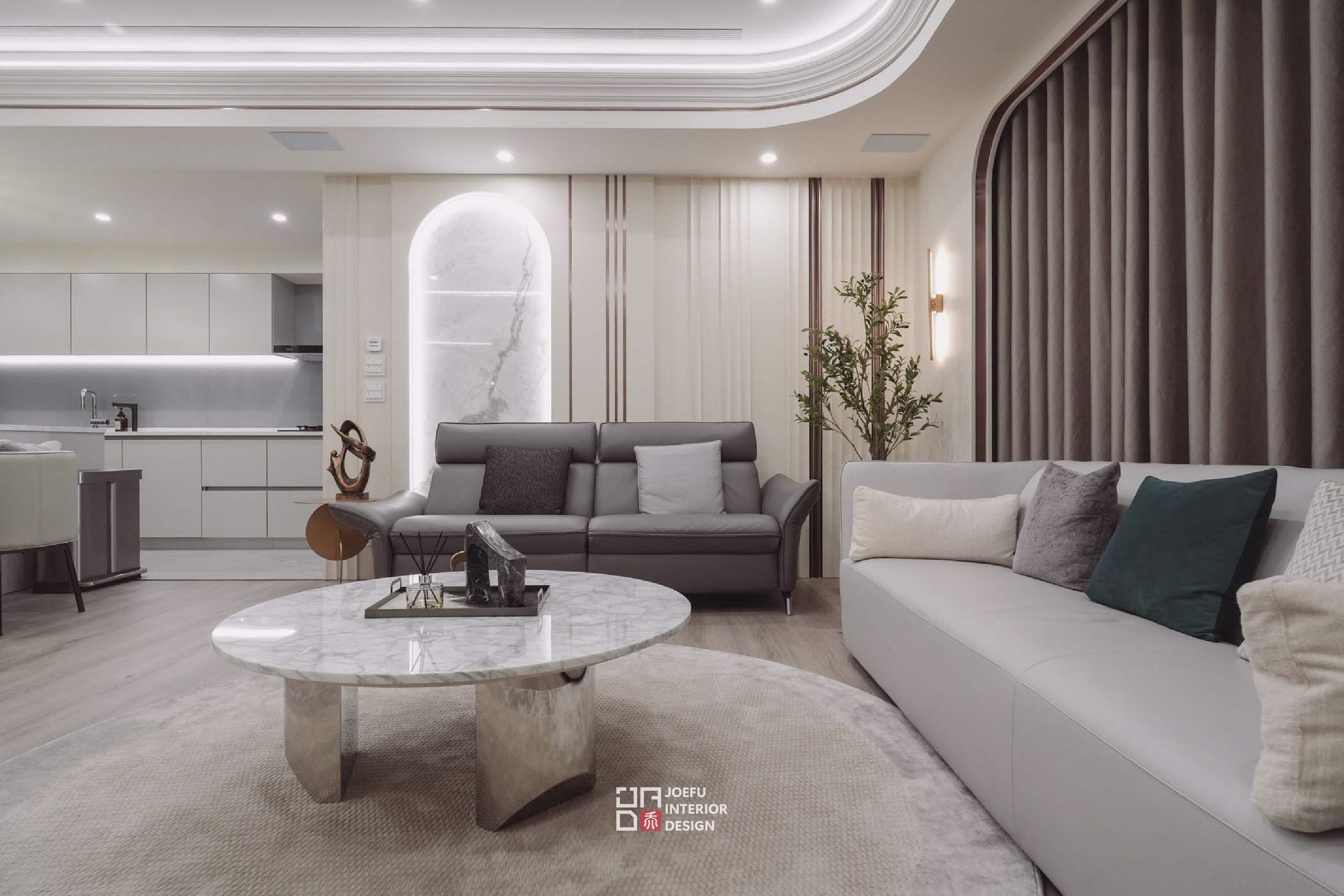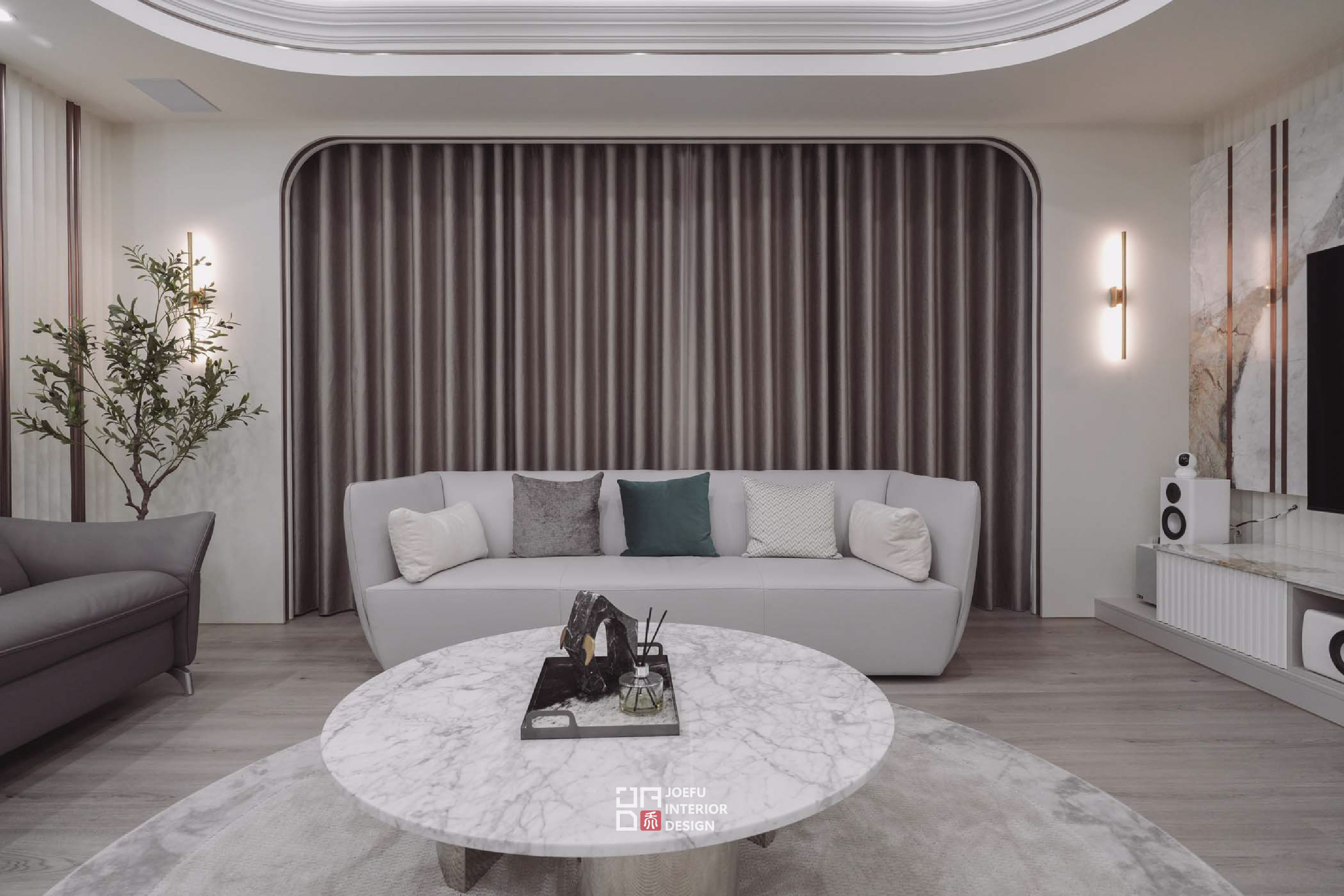 踏進玄關,像是看見一隻孔雀展翅,拖曳著斑斕尾羽悄然開場。弧形玻璃端景穿透光線,水晶吸頂燈將反射光點灑落在帶有藍、金、灰斑紋的大理石地坪上,如夢似幻卻穩定節奏。金色的把手如同孔雀翦翦長睫,細節處的光,襯托出整體空間華而不俗的第一印象